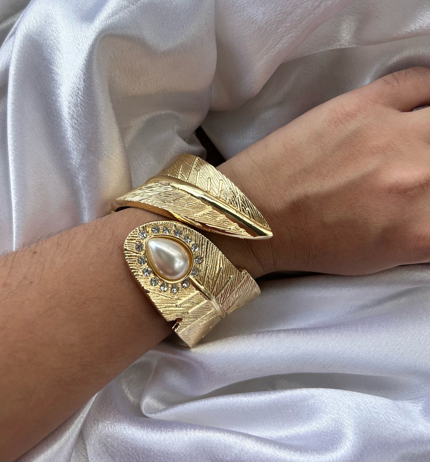 A statement piece that speaks the language of luxury and grace, the Moti Cuff is designed to captivate. This handcrafted golden cuff wraps around your wrist like a sculpted leaf, crowned with a teardrop pearl centerpiece and delicate crystals for just the right amount of sparkle. The textured finish adds depth, while the pearl detail brings in that timeless charm.