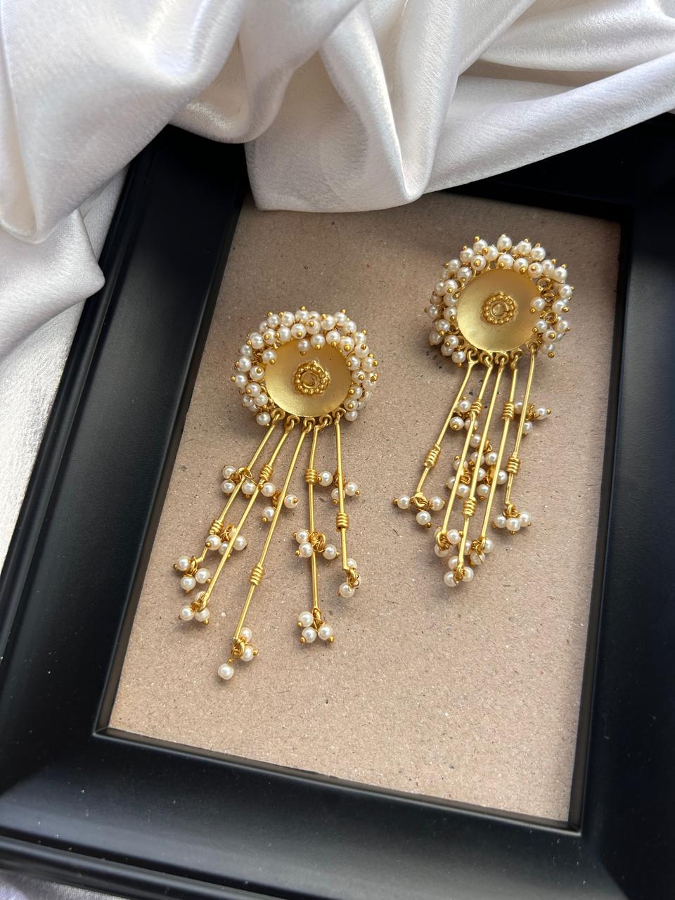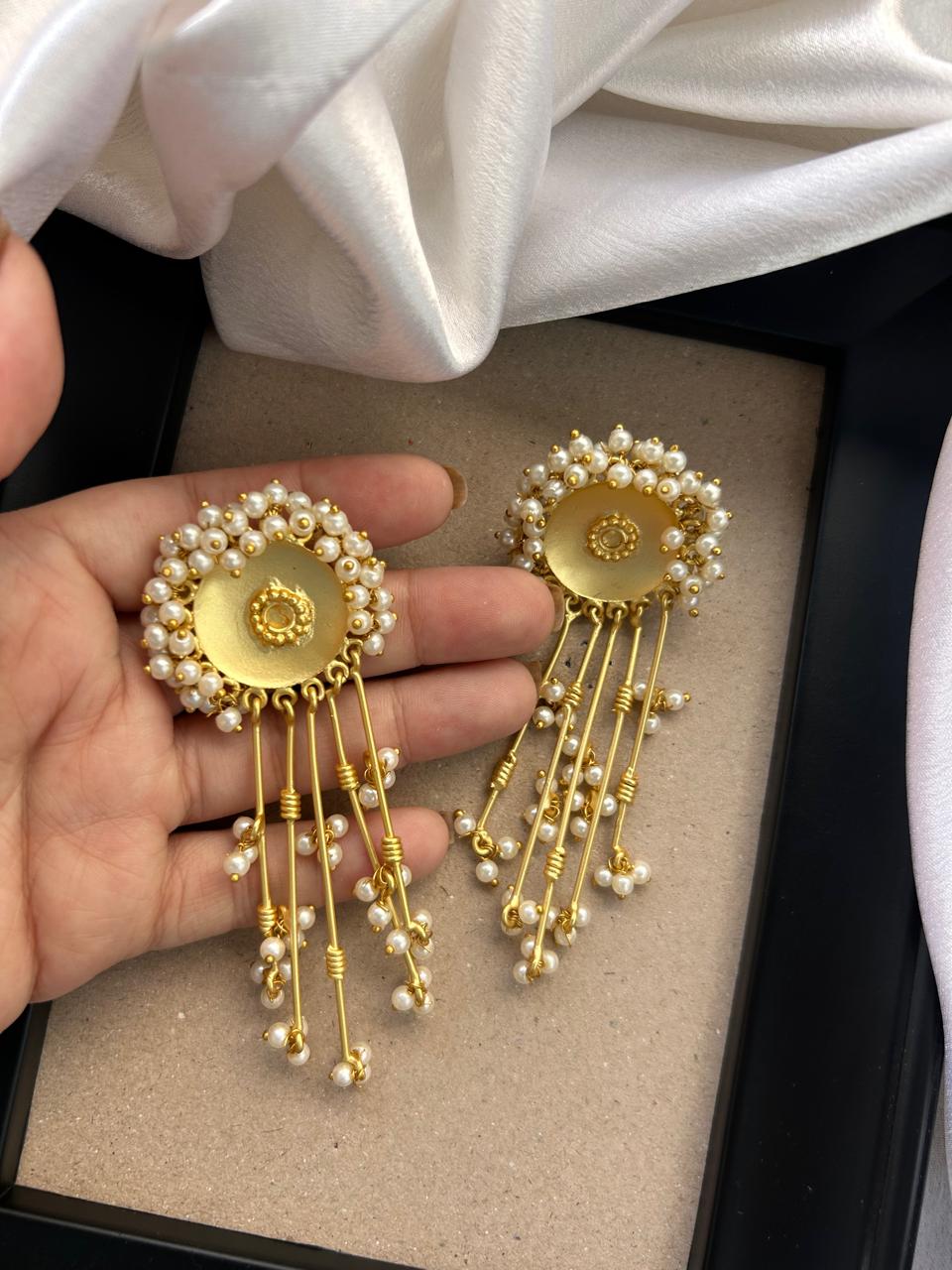 Pearl Halo is a statement of quiet luxury. Crafted from brass, this bold circle stud is adorned with delicate pearl detailing all around and finished with three graceful pearl-lined danglers. It blends structure with softness, making it a standout piece that still feels wearable.