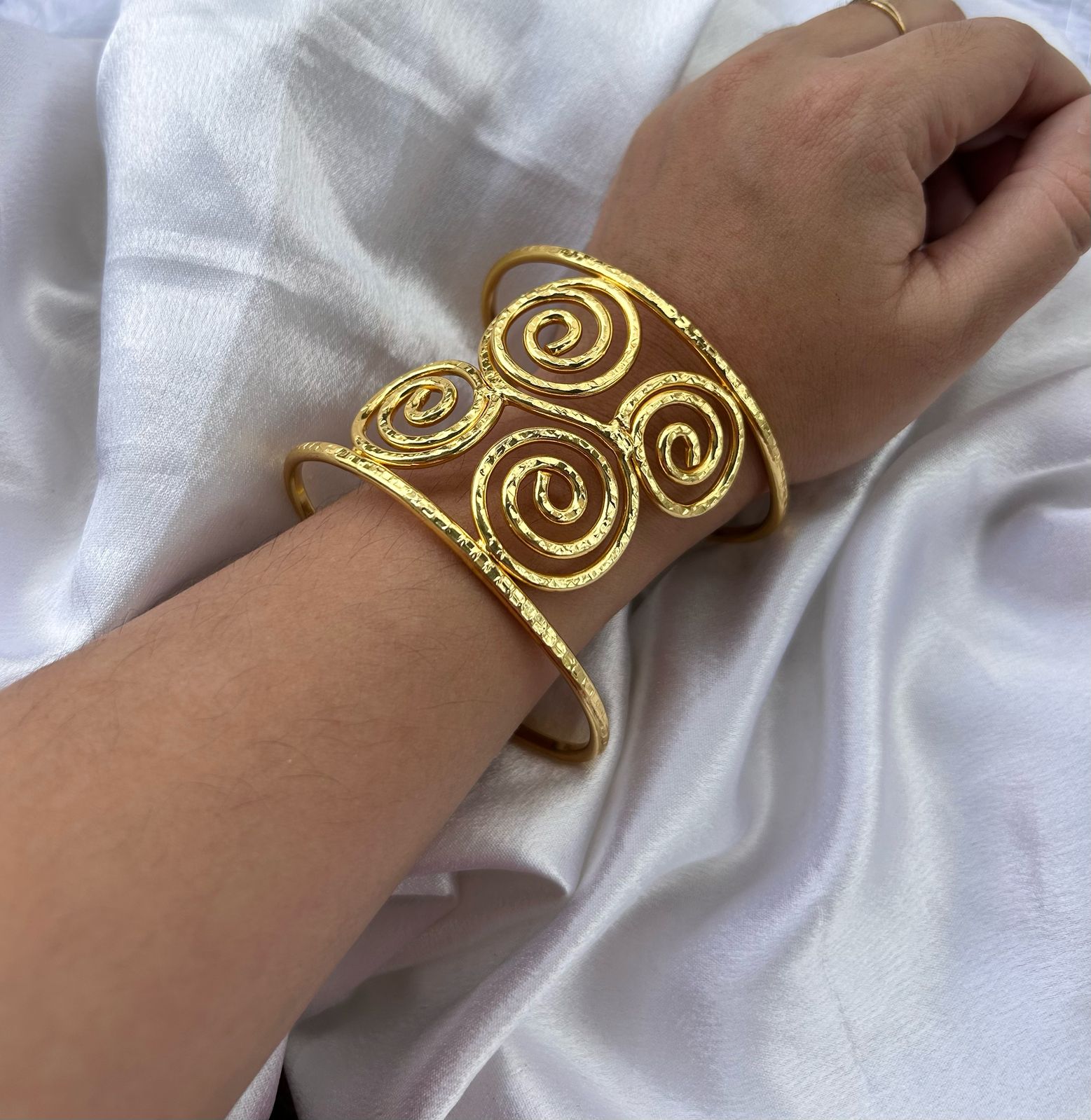 Bold, beautiful, and unapologetically unique — the Spiral Muse is a gold-tone cuff that brings artful geometry to your wrist. With intricately handcrafted spiral motifs and a hammered finish, this piece is a modern ode to ancient design. Lightweight yet impactful, it effortlessly adds drama to even the simplest outfits.